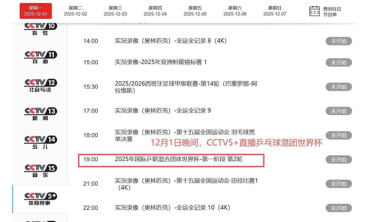 12月1日的赛事冲突尤为明显,中国男篮在首轮主场失利后迎来与韩国的二番战,这场涉及出线关键的比赛自然占据主频道黄金时段。 混合团体世界杯创新赛制要求每场打满三局累计八局定胜负,国乒首战仅用三盘就提前终结比赛,导致王曼昱等主力甚至未能登场。 埃及队虽在首轮8-7险胜智利,但整体实力与国乒存在明显差距,比赛悬念有限也成为转播频道调整的潜在因素。